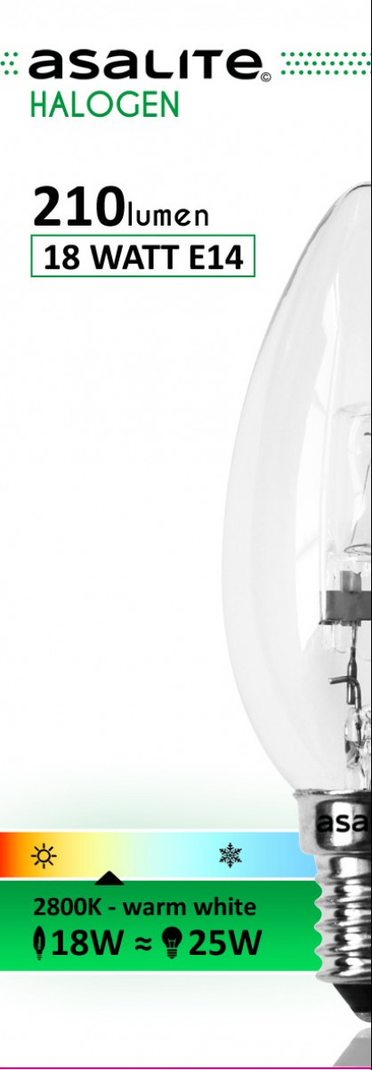 Becul cu halogen Asalite 18W este potrivit pentru înlocuirea unui bec convențional de 25W. Intensitatea luminoasă de 210 Lumeni este însoțită de o temperatură a culorii de 2800 grade Kelvin și un unghi de iluminare de 360 de grade.