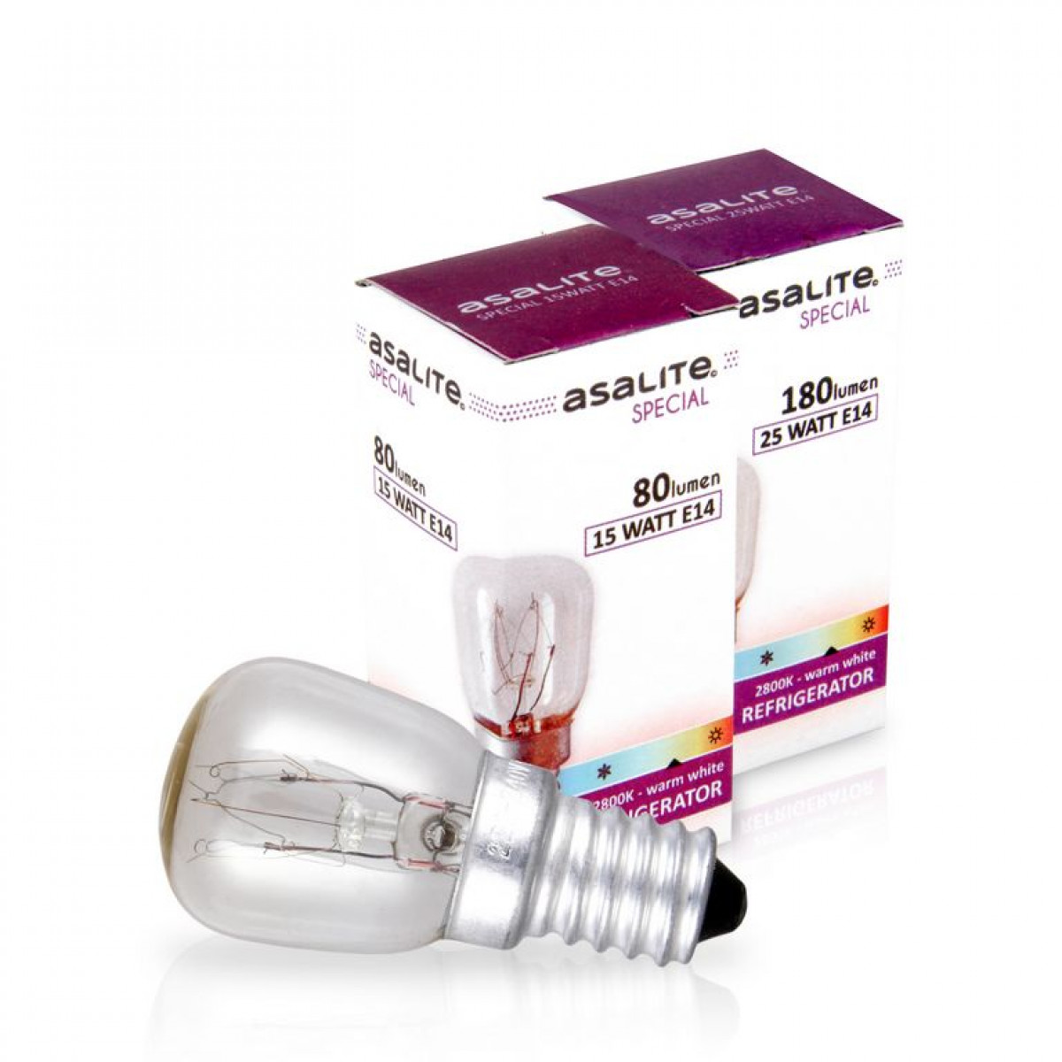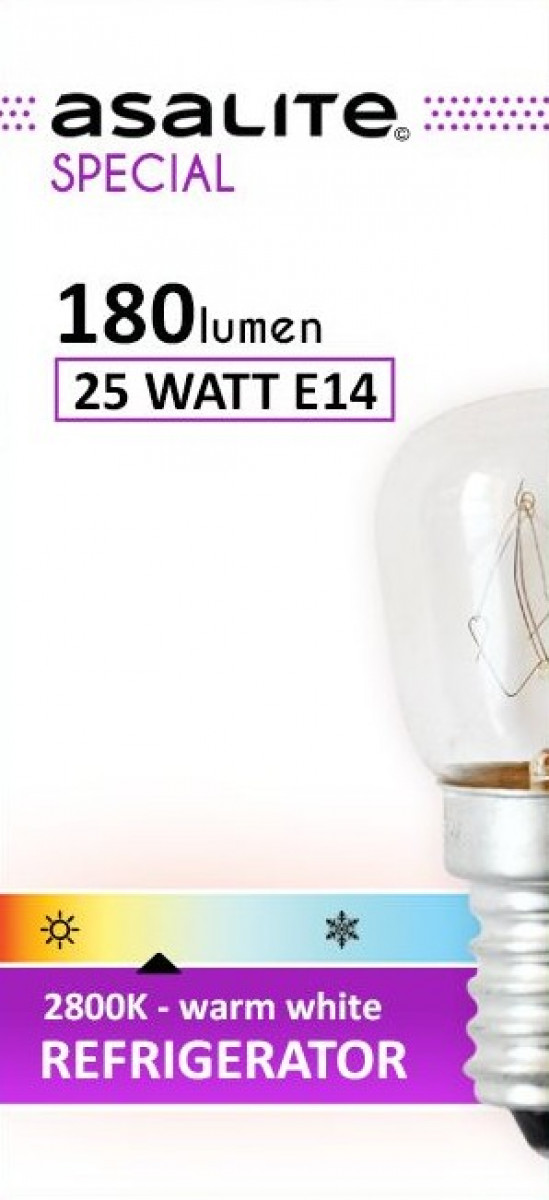 Becul de frigider Asalite 25W este o sursă de lumină utilizată pentru iluminarea echipamentelor de răcire. Produsul are un soclu E14, putere de 15W, la care se cuplează un flux luminos de 80 Lumeni, iar temperatura culorii conferă lumină albă caldă la 2800 grade Kelvin. Dimensiunea sa este de 25x55mm aliniată la nevoile pieței, unghiul său de iluminare este de 300 de grade, iar durata de viață este extrem de mare, ajungând la 1000 de ore.