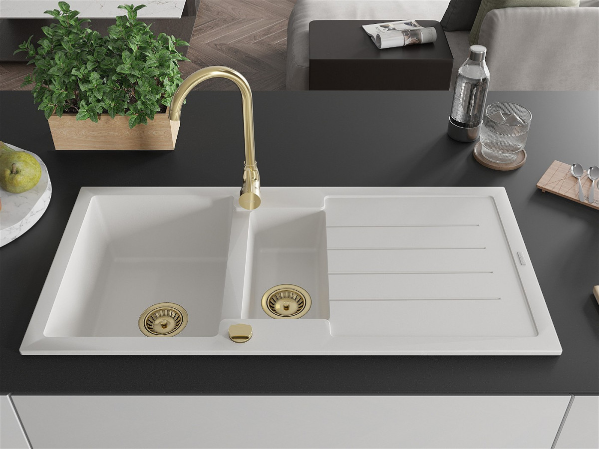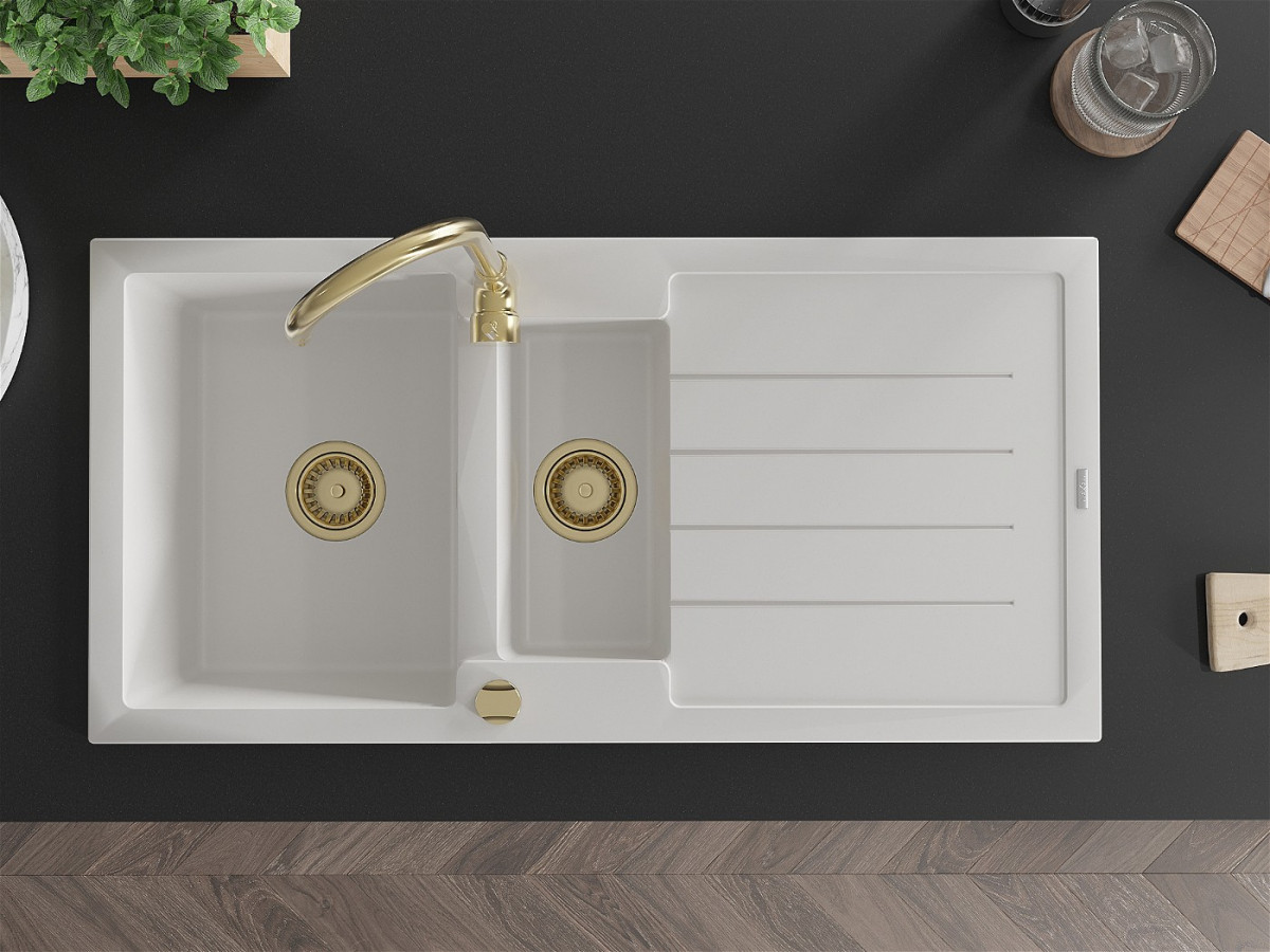 Mexen Andres Chiuveta bucatarie granit 1,5 cuva + picurator+ cadou pop up sifon 1000 x 500 mm, alb , sifon auriu - 6515101510-20-G