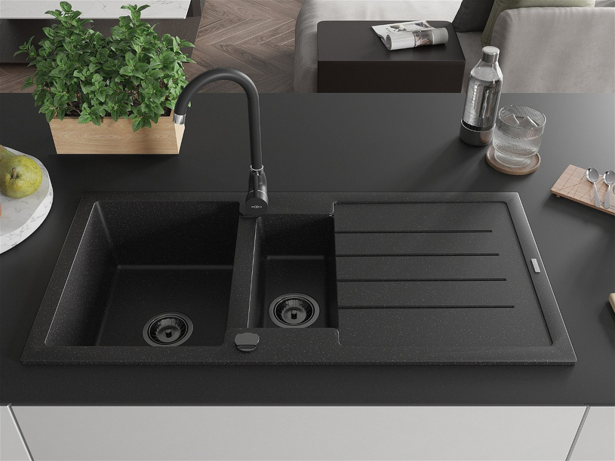 Chiuveta din granit Mexen este disponibilă și cu tavă de scurgere, cu un bazin adânc proiectat special, în culorile granulate negru, negru, bej, alb și gri. Poate fi folosit în ambele versiuni din dreapta și din stânga. Chiuveta din granit bazin Mexen cu tava de scurgere min. Poate fi instalat într-un dulap adânc de 45 cm.