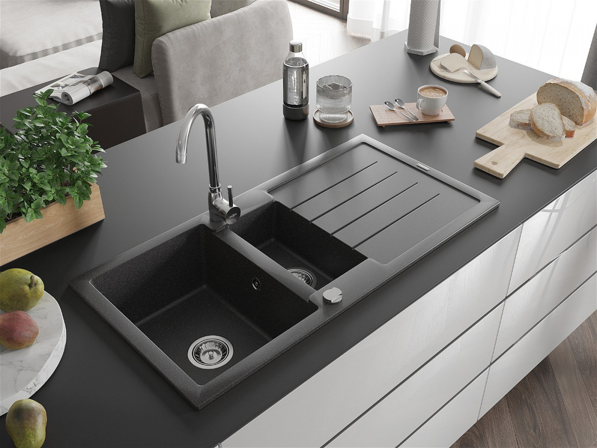 Chiuveta din granit Mexen este disponibilă și cu tavă de scurgere, cu un bazin adânc proiectat special, în culorile granulate negru, negru, bej, alb și gri. Poate fi folosit în ambele versiuni din dreapta și din stânga. Chiuveta din granit bazin Mexen cu tava de scurgere min. Poate fi instalat într-un dulap adânc de 45 cm.