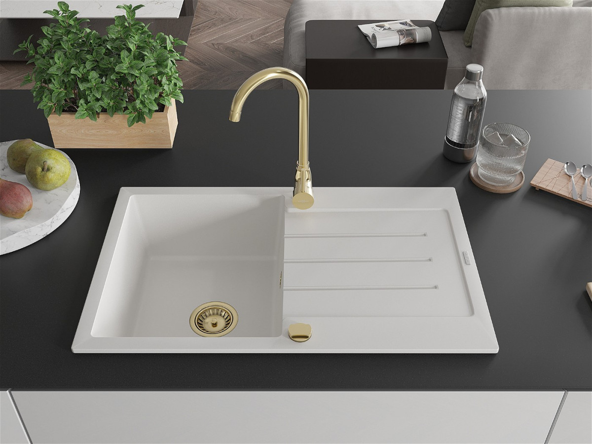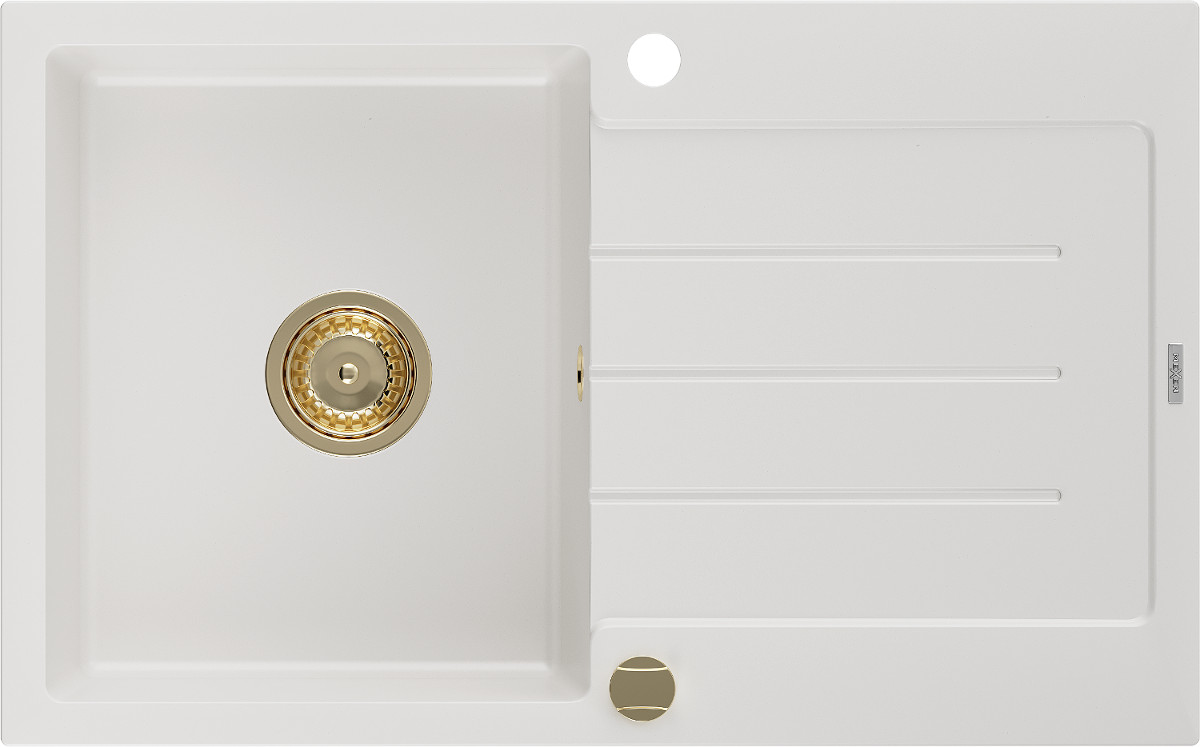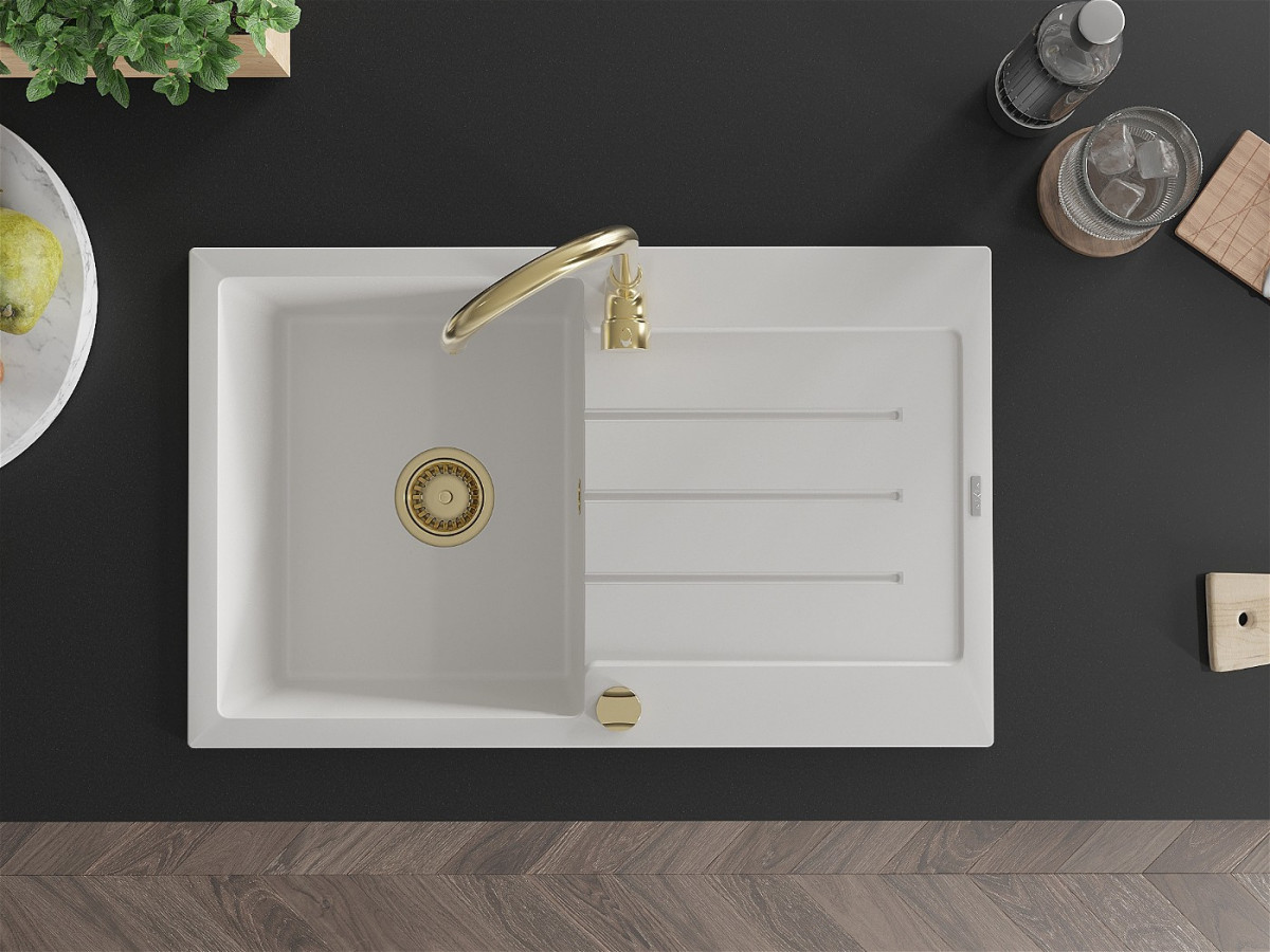 Mexen Bruno Chiuveta bucatarie granit 1 cuva + picurator+ cadou pop up sifon 795 x 495 mm, alb , sifon auriu - 6513791010-20-G Prezentarea