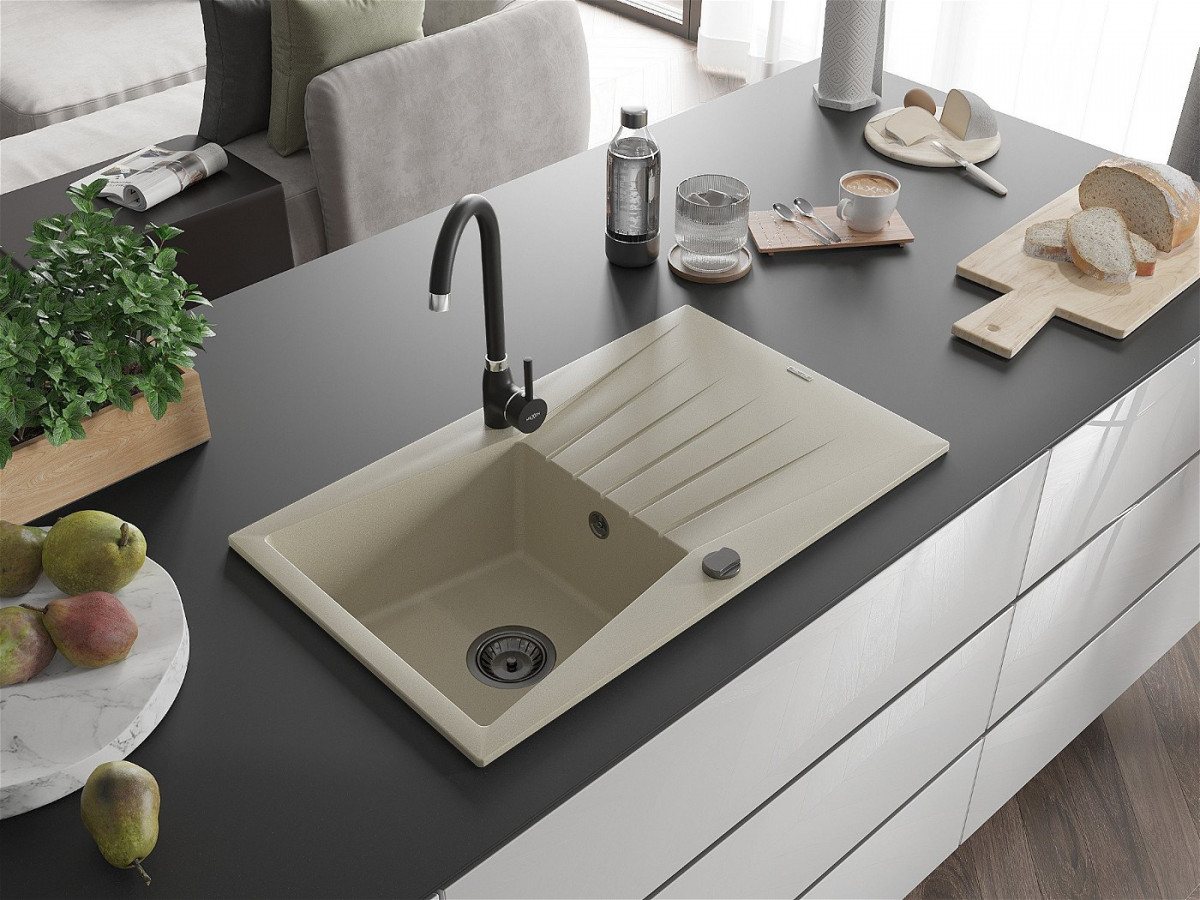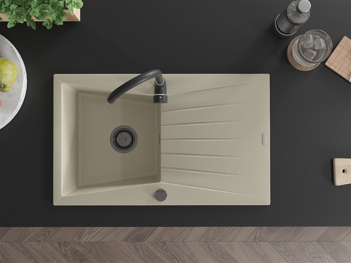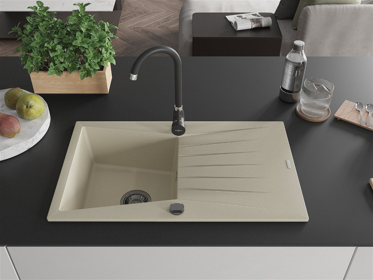 Mexen Cesar Chiuveta bucatarie granit 1 cuva + picurator+ cadou pop up sifon 775 x 470 mm, beige, sifon negru - 6514771010-69-B Prezentarea