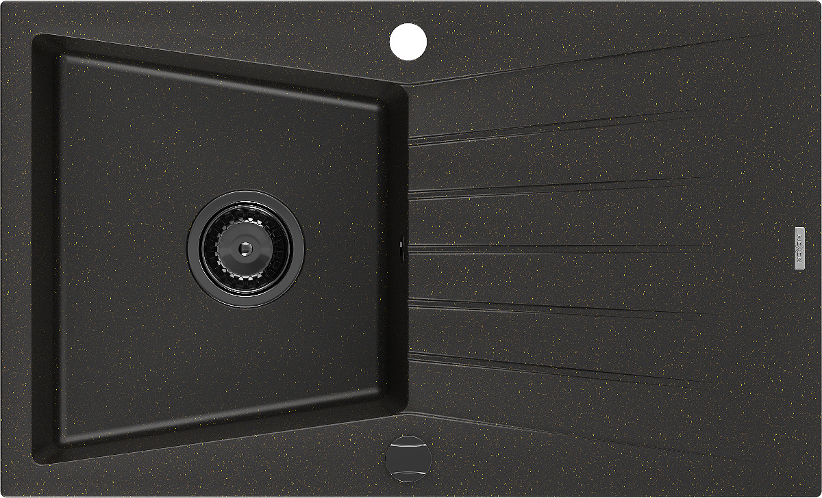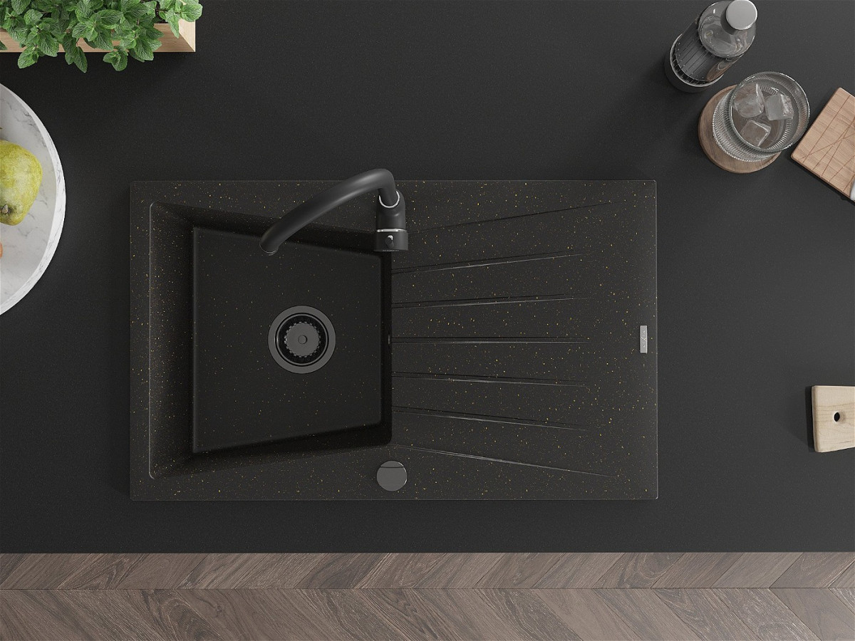 Mexen Cesar Chiuveta bucatarie granit 1 cuva + picurator+ cadou pop up sifon 775 x 470 mm, negru / auriu, sifon negru - 6514771010-75-B Prezentarea