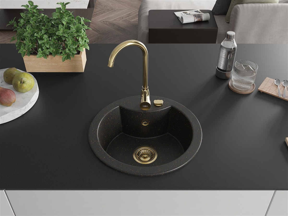 Mexen Diego Chiuveta bucatarie granit rotund+ cadou pop up sifon 488 x 480 mm, negru / auriu, sifon auriu - 6512481000-75-G Prezentarea