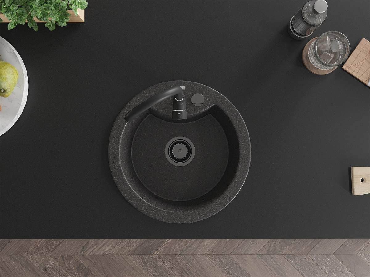 Mexen Diego Chiuveta bucatarie granit rotund+ cadou pop up sifon 488 x 480 mm, negru piatra, sifon negru - 6512481000-76-B Prezentarea