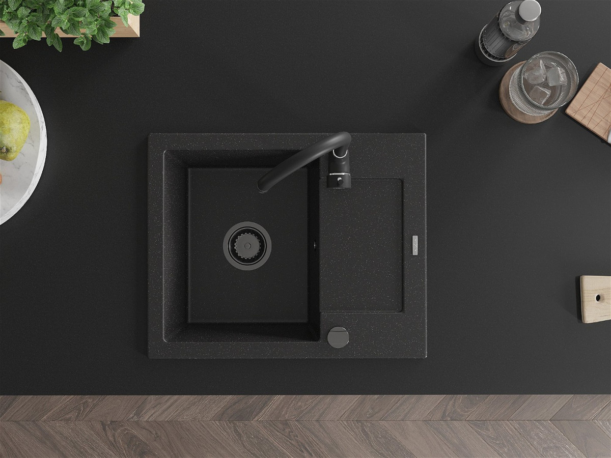 Mexen Enzo Chiuveta bucatarie granit 1 cuva + picurator+ cadou pop up sifon 576 x 465 mm, negru / chrom, sifon negru - 6506571005-73-B Prezentarea