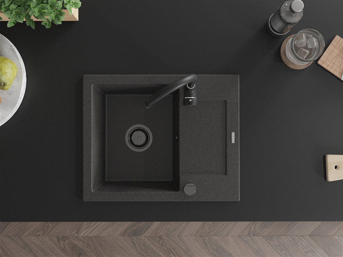 Mexen Enzo Chiuveta bucatarie granit 1 cuva + picurator+ cadou pop up sifon 576 x 465 mm, negru piatra, sifon negru - 6506571005-76-B
