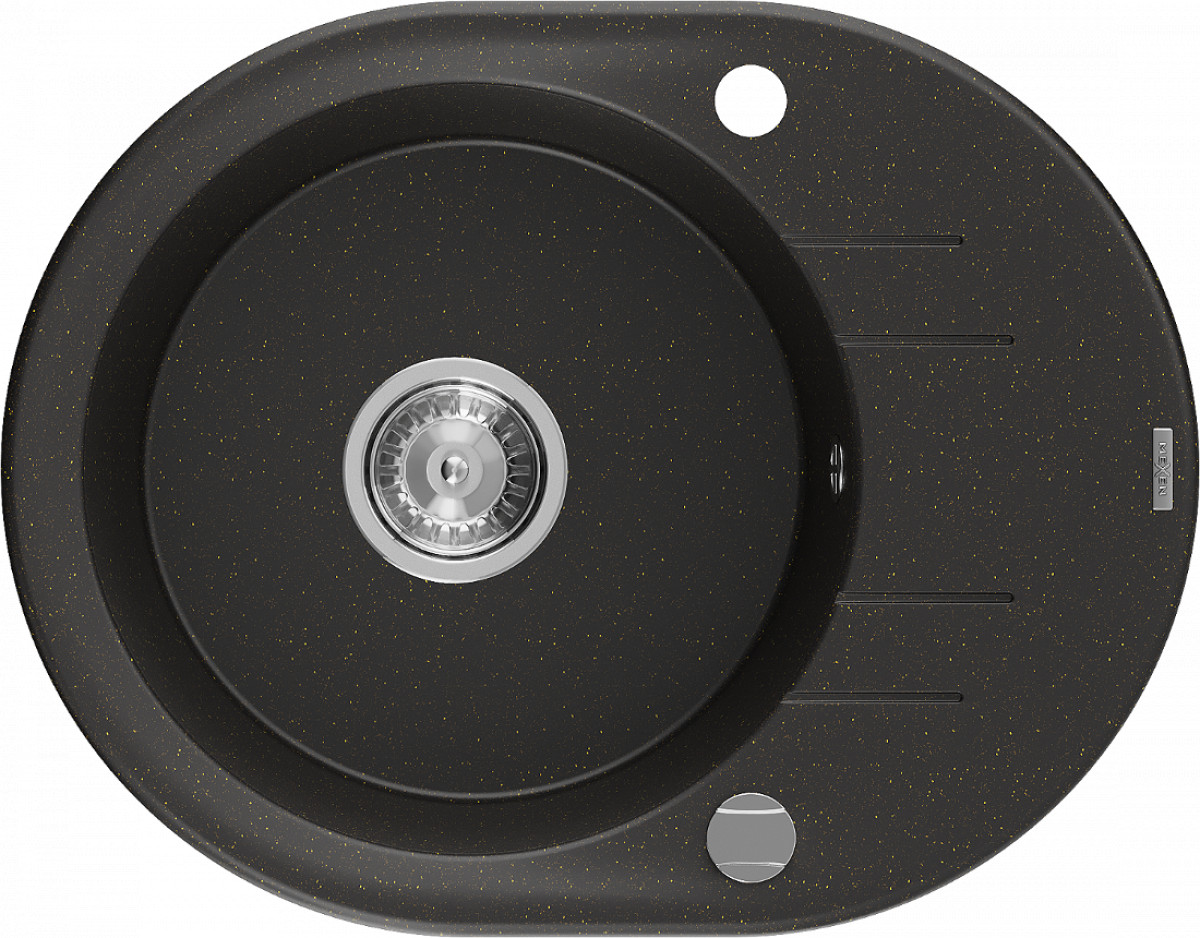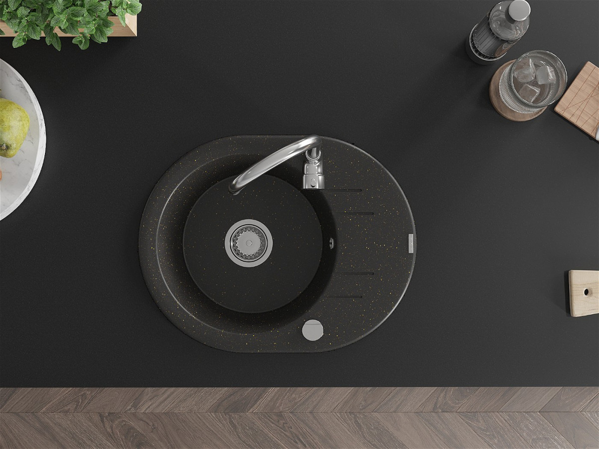Mexen Kevin Chiuveta bucatarie granit rotund + cadou pop up sifon 586 x 458 mm, negru / auriu, sifon chrom - 6517581005-75 Prezentarea