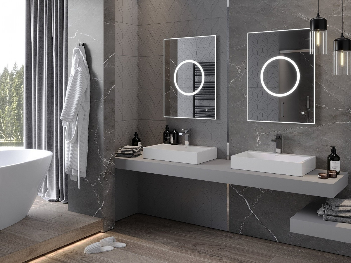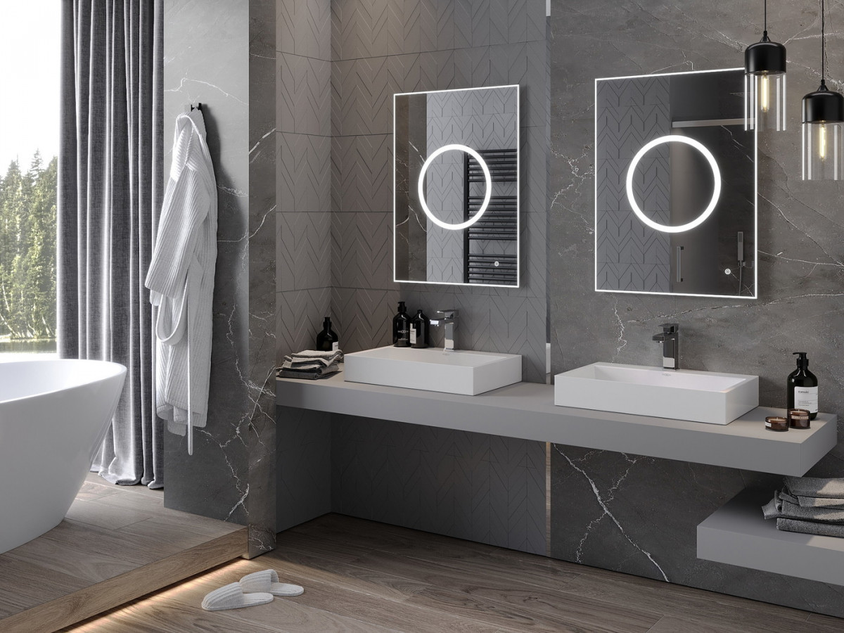 Oglinda cu LED de designer de lux, care transforma baia ta intr-un spatiu nou nu numai datorita frumusetii si caracterului practic, ci mai ales datorita accesoriului. Iluminare minunată cu funcție de dezaburire.