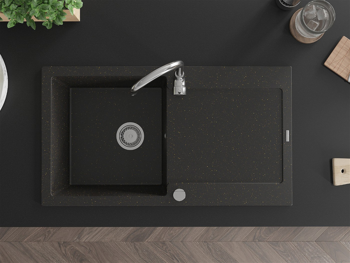 Mexen Leo Chiuveta bucatarie granit 1 cuva + picurator+ cadou pop up sifon 90 x 50 cm, negru / auriu - 6501901010-75 Prezentarea