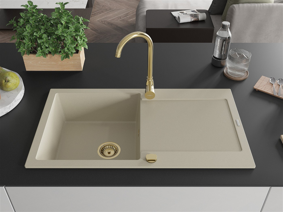 Mexen Leo Chiuveta bucatarie granit 1 cuva + picurator+ cadou pop up sifon 900 x 500 mm, beige, sifon auriu - 6501901010-69-G Prezentarea