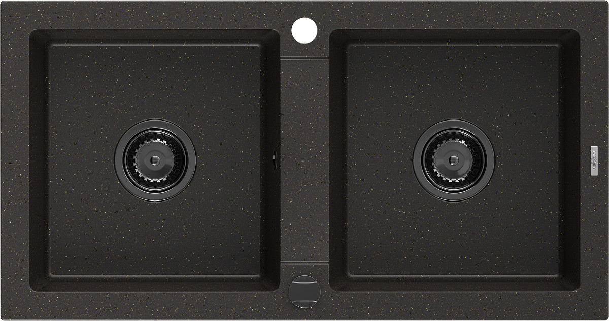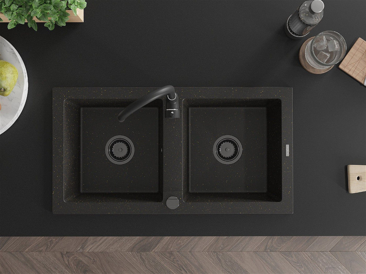 Mexen Mario Chiuveta bucatarie granit 2 cuva+ cadou pop up sifon 820 x 436 mm, negru / auriu, sifon negru - 6504822000-75-B Prezentarea