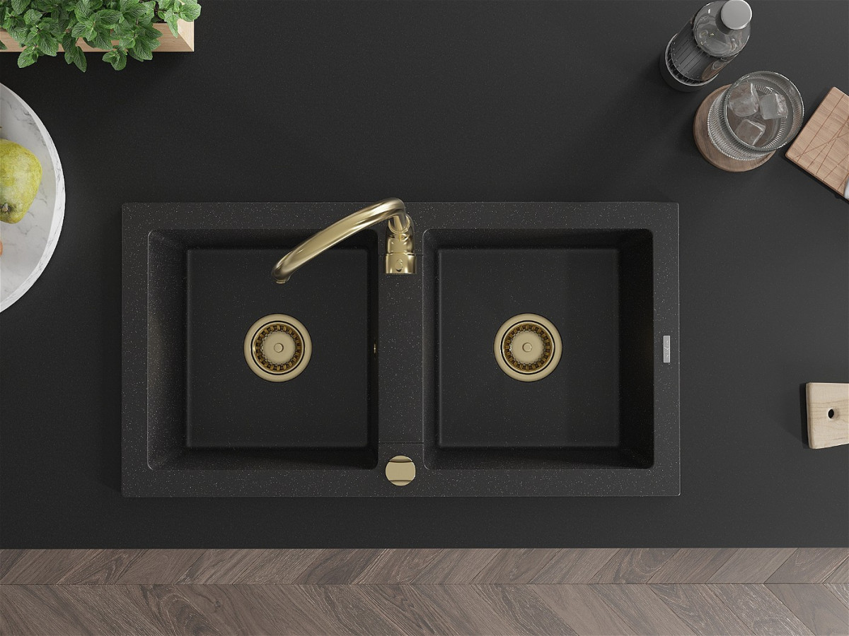 Mexen Mario Chiuveta bucatarie granit 2 cuva+ cadou pop up sifon 820 x 436 mm, negru / chrom, sifon auriu - 6504822000-73-G