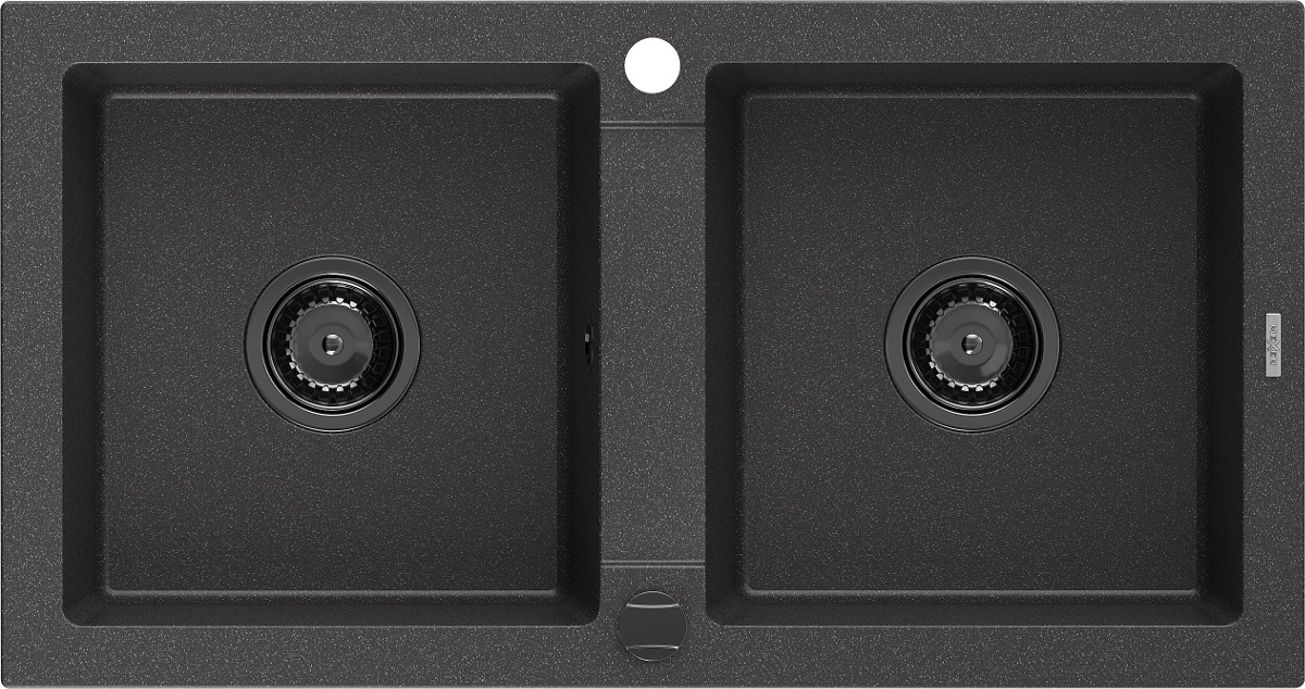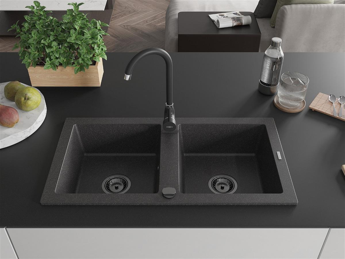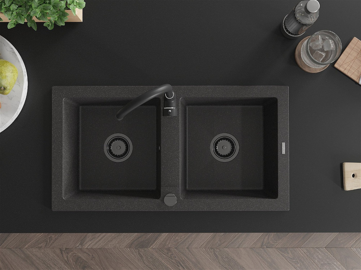 Mexen Mario Chiuveta bucatarie granit 2 cuva+ cadou pop up sifon 820 x 436 mm, negru piatra, sifon negru - 6504822000-76-B Prezentarea