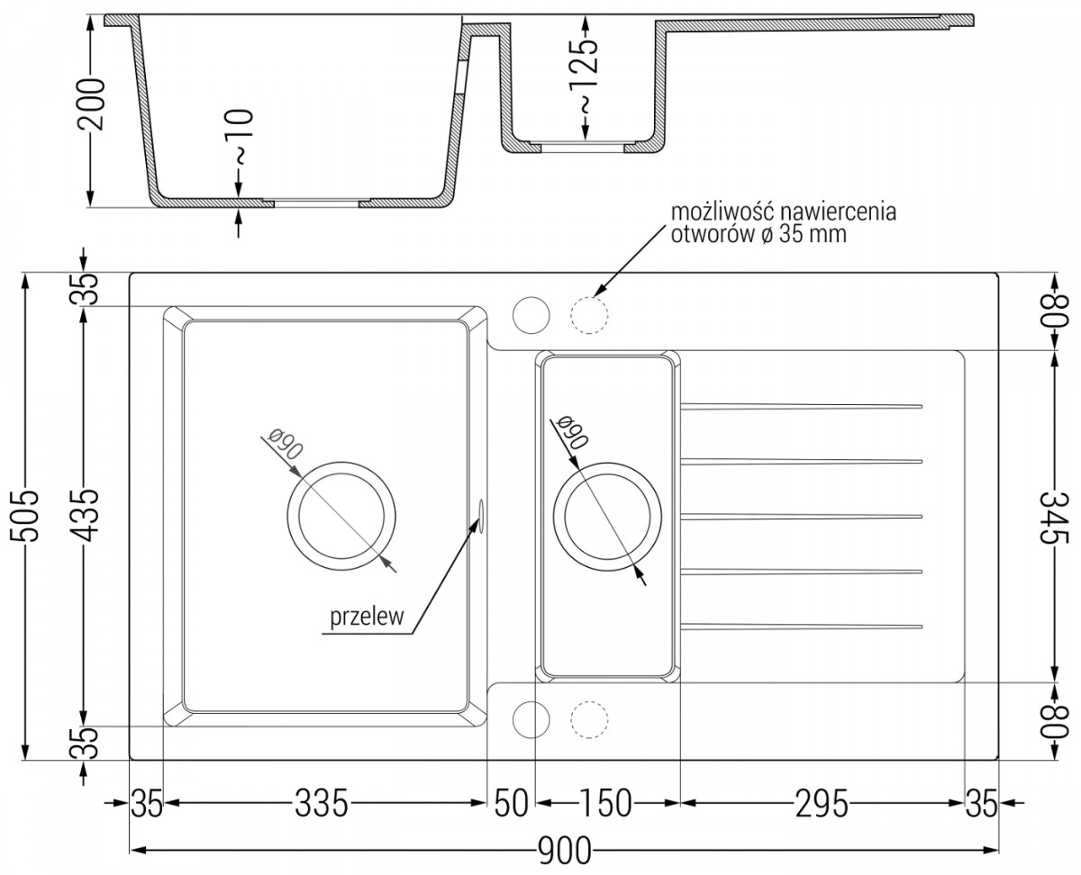 Chiuveta din granit Mexen este disponibilă și cu tavă de scurgere, cu un bazin adânc proiectat special, în culorile granulate negru, negru, bej, alb și gri. Poate fi folosit în ambele versiuni din dreapta și din stânga. Chiuveta din granit bazin Mexen cu tava de scurgere min. Poate fi instalat într-un dulap adânc de 45 cm.