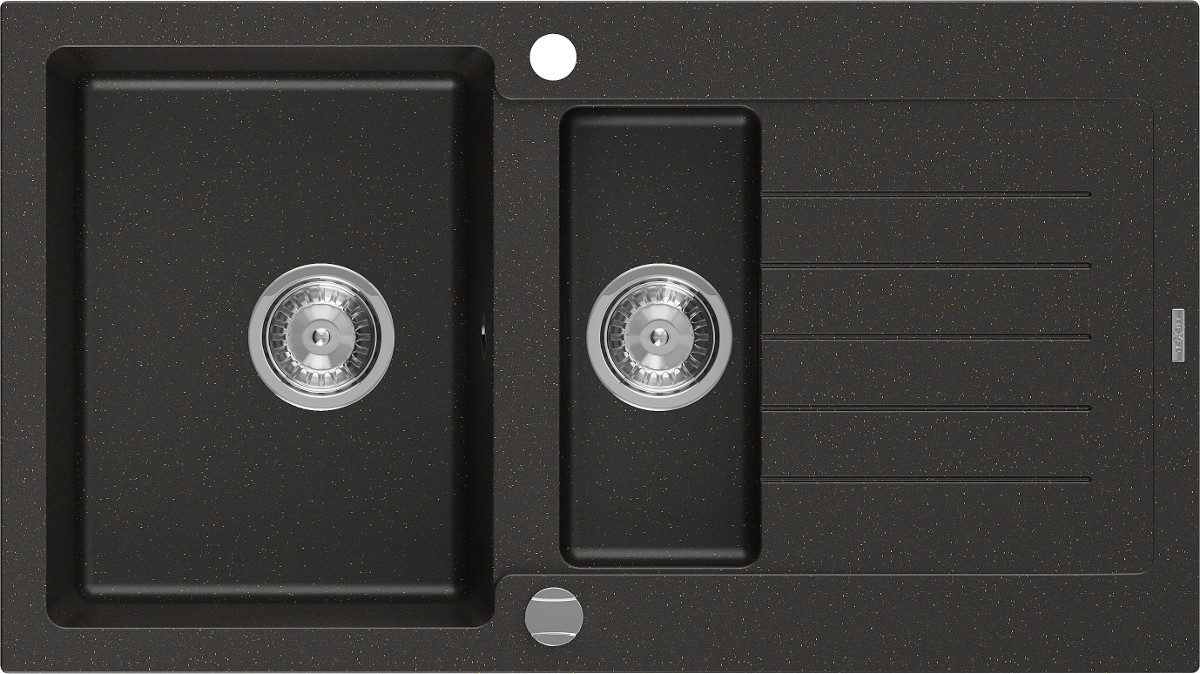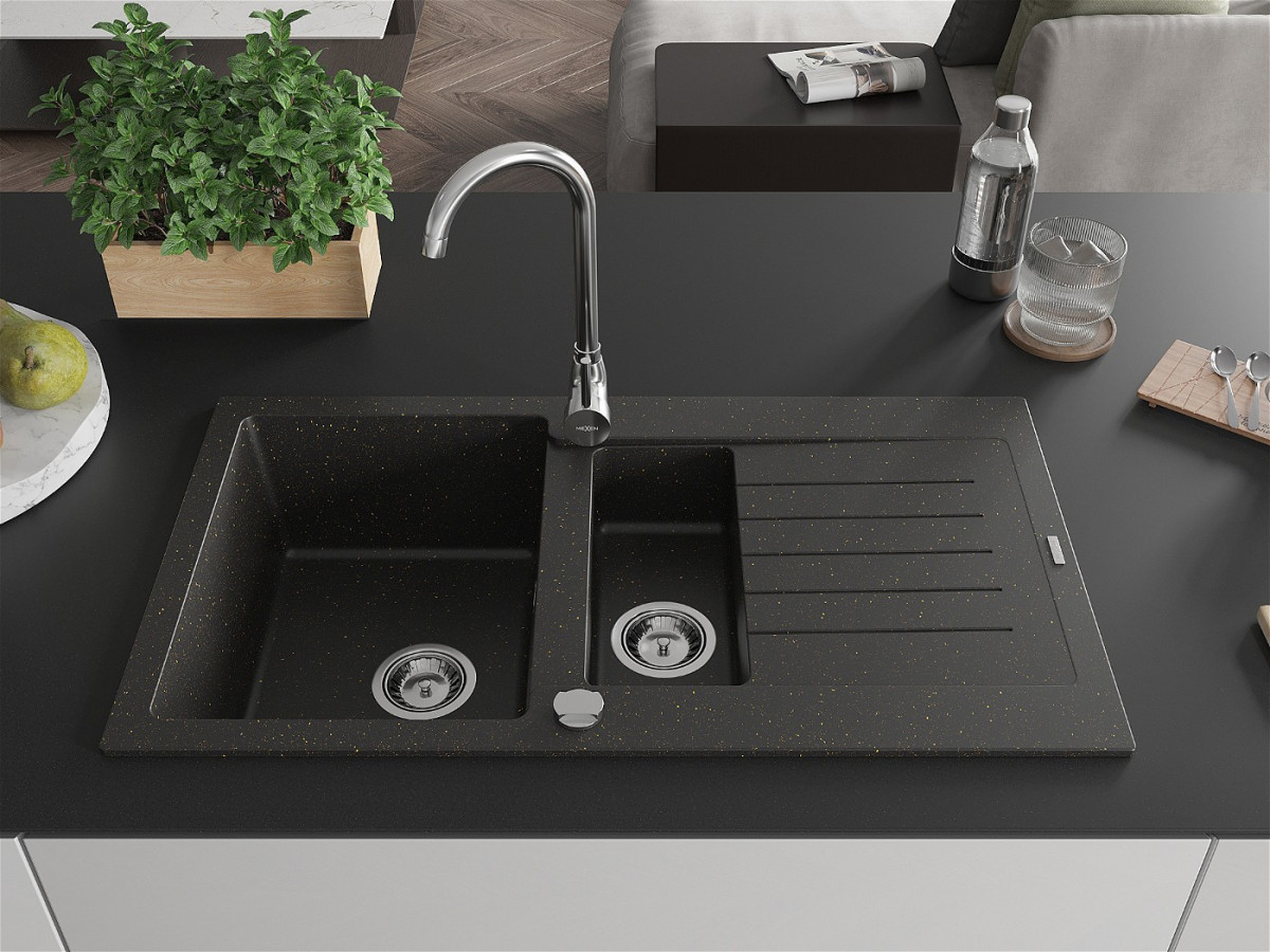 Mexen Matias Chiuveta bucatarie granit 1,5 cuva + picurator+ cadou pop up sifon 90 x 50,5 cm, negru / auriu - 6502901505-75 Prezentarea