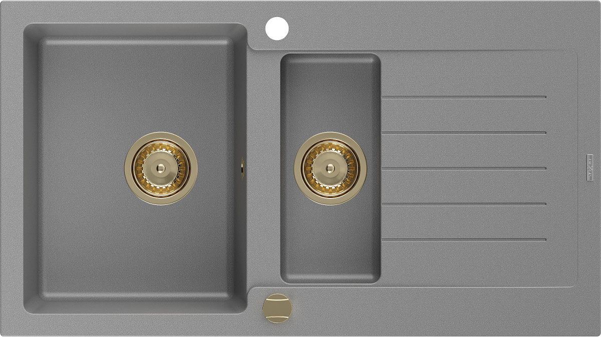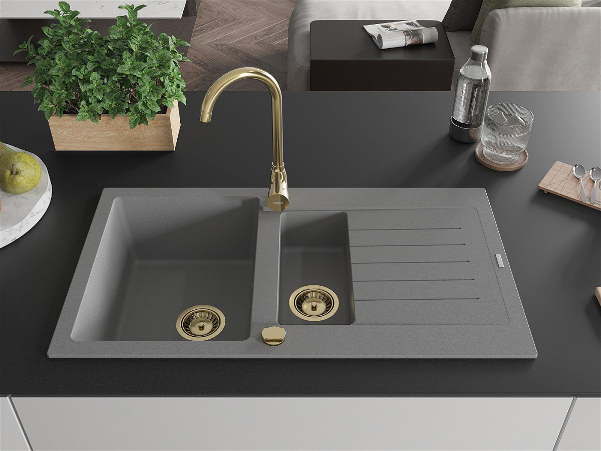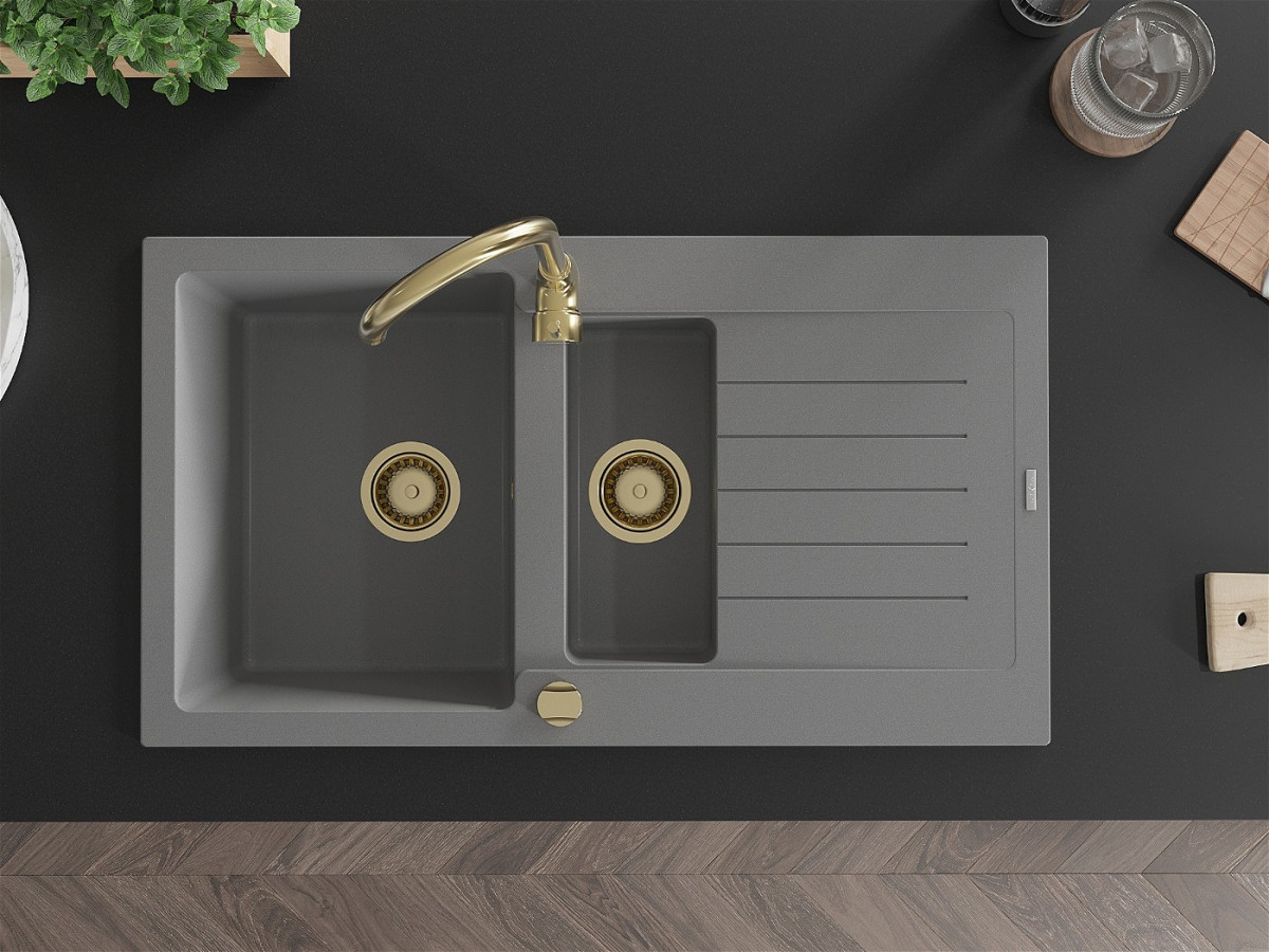 Mexen Matias Chiuveta bucatarie granit 1,5 cuva + picurator+ cadou pop up sifon 900 x 505 mm, gri , sifon auriu - 6502901505-71-G Prezentarea