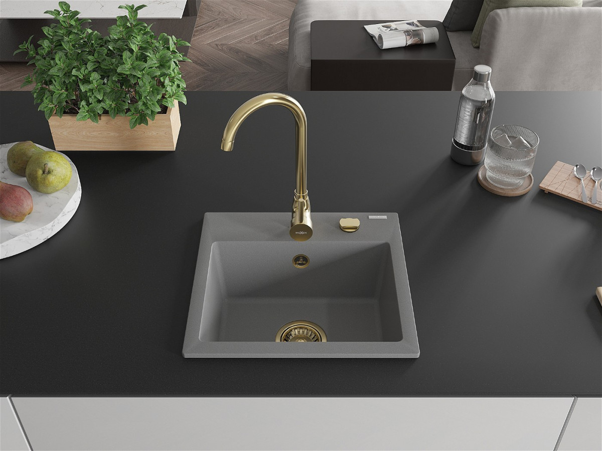 Mexen Milo Chiuveta bucatarie granit 1 cuva + cadou pop up sifon 435 x 410 mm, gri , sifon auriu - 6505441000-71-G Prezentarea