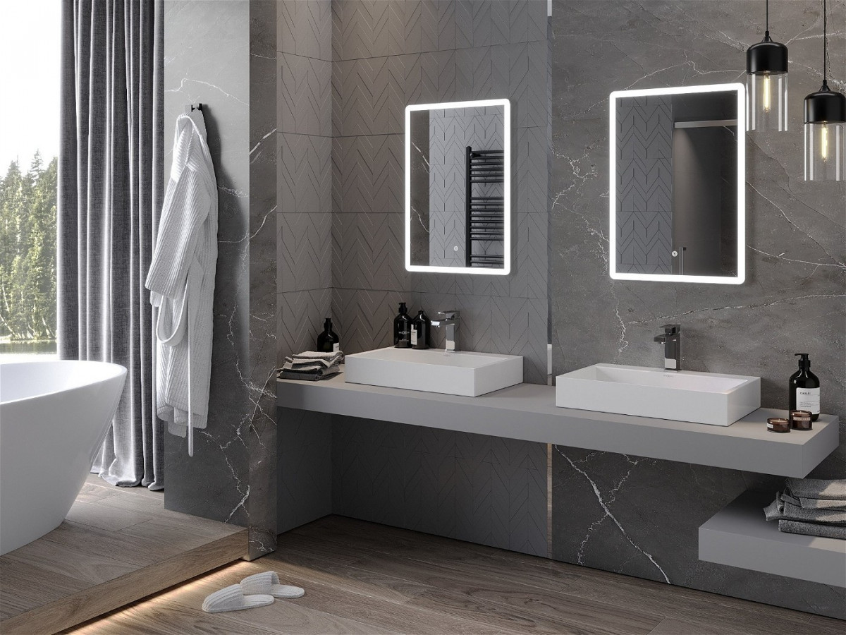 Oglinda cu LED de designer de lux, care transforma baia ta intr-un spatiu nou nu numai datorita frumusetii si caracterului practic, ci mai ales datorita accesoriului. Iluminare minunată cu funcție de dezaburire.