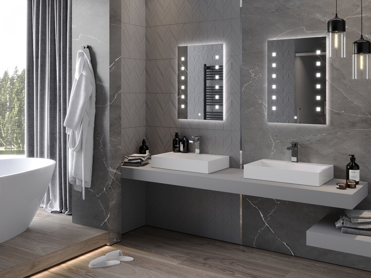 Oglinda cu LED de designer de lux, care transforma baia ta intr-un spatiu nou nu numai datorita frumusetii si caracterului practic, ci mai ales datorita accesoriului. Iluminare minunată cu funcție de dezaburire.