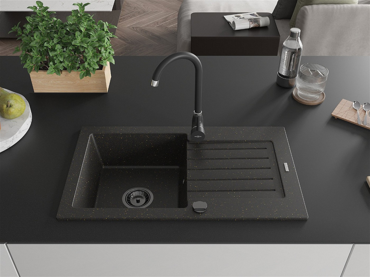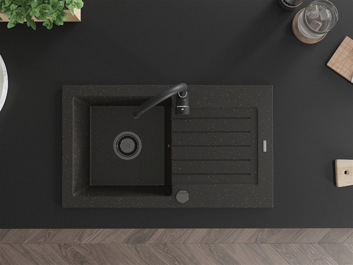 Mexen Pablo Chiuveta bucatarie granit 1 cuva + picurator+ cadou pop up sifon 752 x 436 mm, negru / auriu, sifon negru - 6510751010-75-B