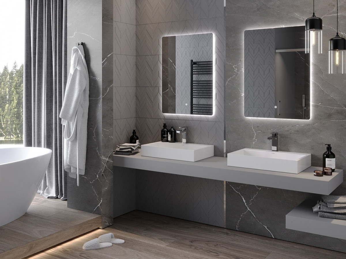 Oglinda cu LED de designer de lux, care transforma baia ta intr-un spatiu nou nu numai datorita frumusetii si caracterului practic, ci mai ales datorita accesoriului. Iluminare minunată cu funcție de dezaburire.