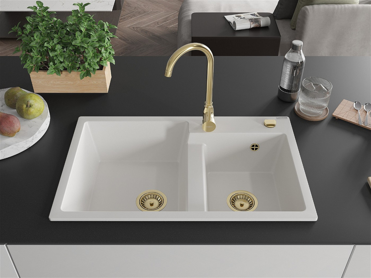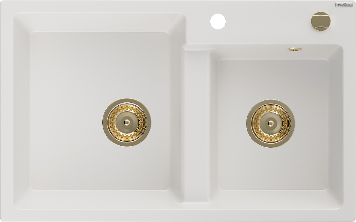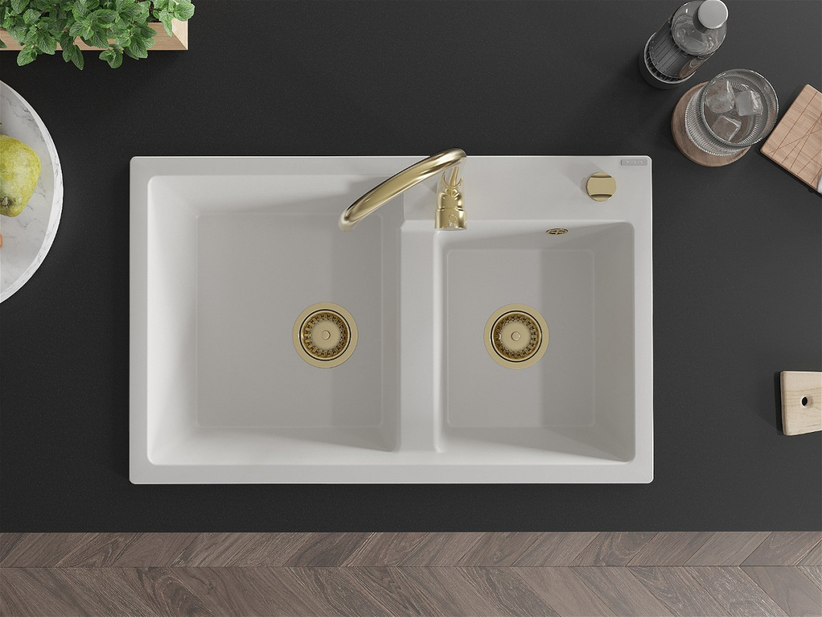 Mexen Tomas Chiuveta bucatarie granit 2 cuva+ cadou pop up sifon 800 x 500 mm, alb , sifon auriu - 6516802000-20-G Prezentarea