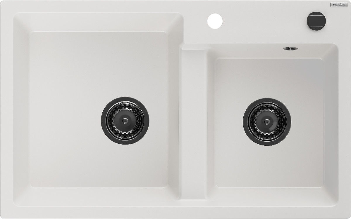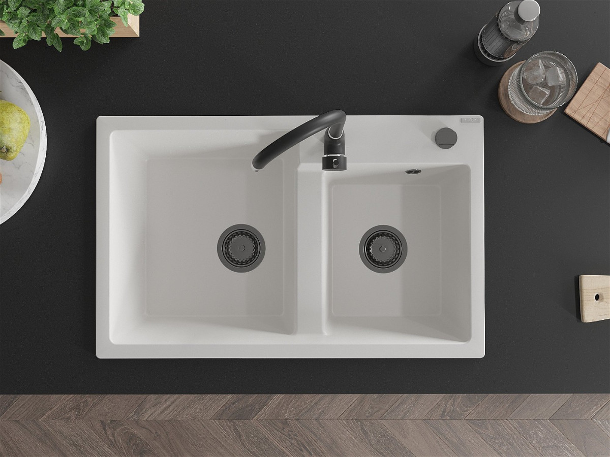 Mexen Tomas Chiuveta bucatarie granit 2 cuva+ cadou pop up sifon 800 x 500 mm, alb , sifon negru - 6516802000-20-B Prezentarea