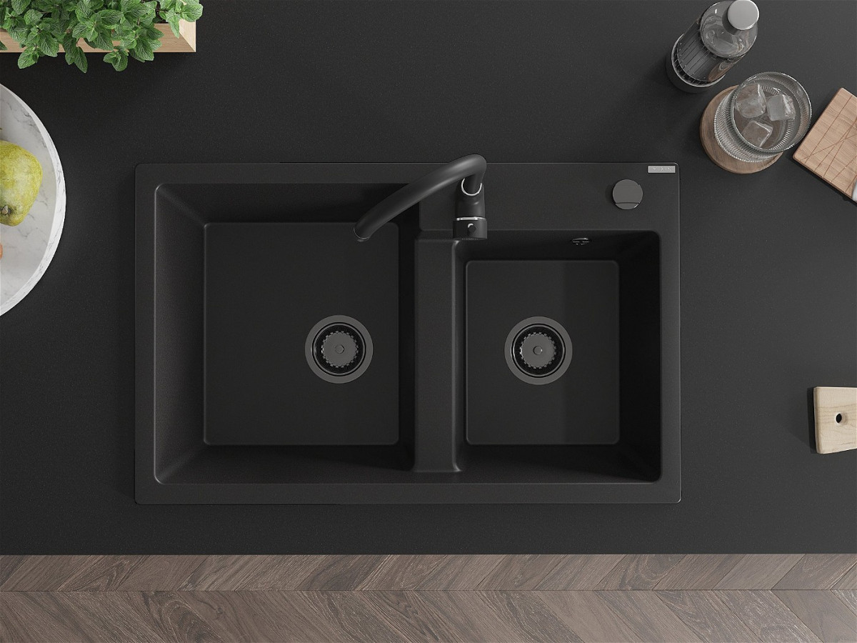 Mexen Tomas Chiuveta bucatarie granit 2 cuva+ cadou pop up sifon 800 x 500 mm, negru , sifon negru - 6516802000-77-B Prezentarea
