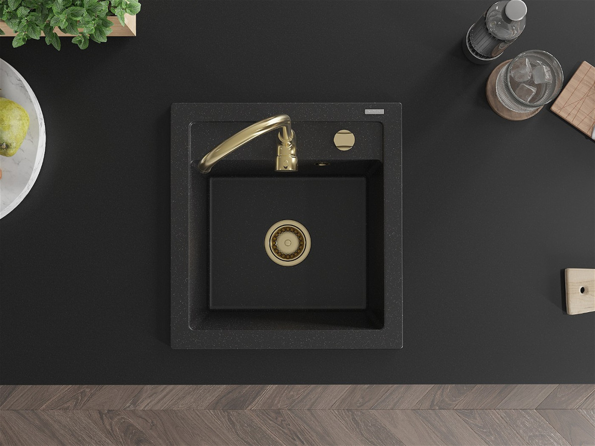 Mexen Vito   Chiuveta bucatarie granit 1 cuva + cadou pop up sifon  520 x 490 mm, negru / chrom, sifon  auriu  - 6503521000-73-G